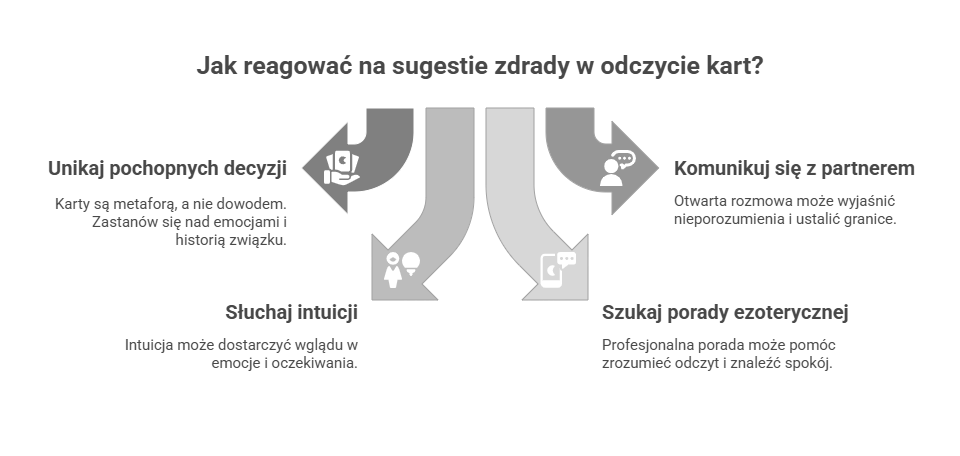 Przede wszystkim, nie należy podejmować pochopnych decyzji. Karty tarota oferują perspektywę, ale nigdy nie są dowodem, który jest niepodważalnym – pozostają metaforą, narzędziem do refleksji. Przyjrzeć się trzeba własnym emocjom, zastanowić nad dotychczasowym przebiegiem związku. Czasami wyjawienie mogących wskazywać na zdradę kart, może być równocześnie obrazem naszych własnych lęków lub niedomówień, które unosiły się w powietrzu związku.
