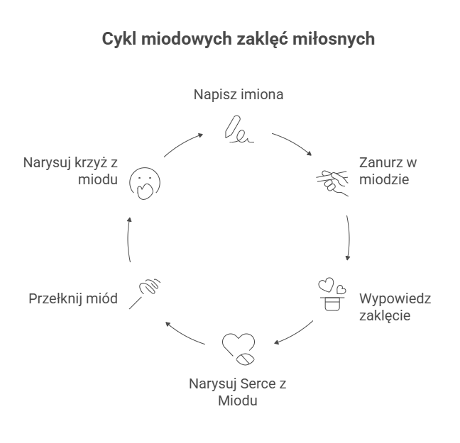 Rytuał rozpoczyna się od napisania imienia ukochanej osoby na kartce papieru, a następnie swojego imienia, tak by się nakładały. Istotne jest, aby wyraźnie zdefiniować intencję – czy chcemy powrotu byłego partnera, przyciągnięcia nowej osoby, czy wzmocnienia obecnej relacji. Po spisaniu życzenia palce zakochanego lekko zanurzane są w miodzie, a następnie wypowiada się zaklęcie: „Tak jak miód jest słodki, taki będziesz dla mnie”. To symboliczne gesty mają przyciągnąć słodką miłość i związek, który nie pozwoli o sobie zapomnieć.