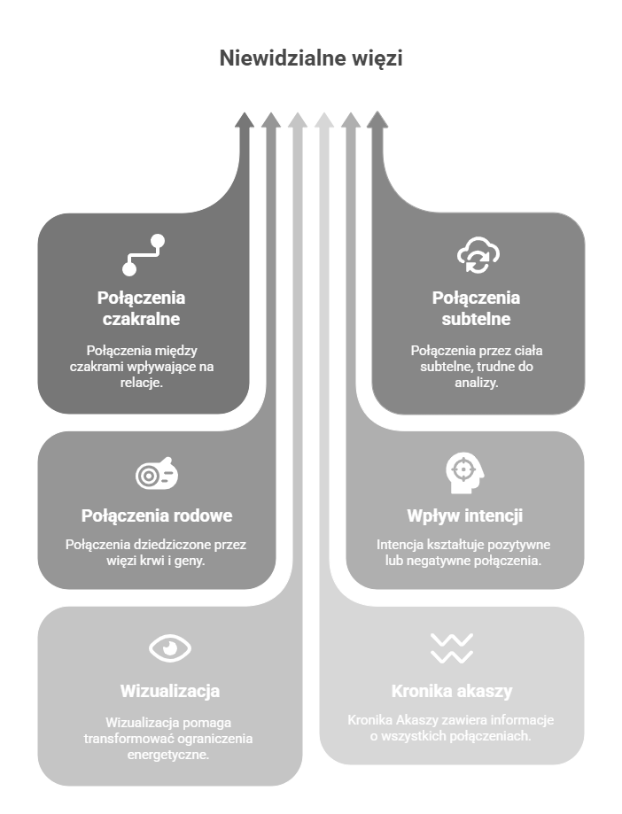 Obejmują ciała subtelne i nie są bezpośrednio związane z czakrami. Ich analiza jest trudniejsza, ale są one widoczne w aurze i wizualizacjach jako nitki czy pajęczyny energii. Przykładowo, dzieci przejmujące ograniczenia emocjonalne rodziców mogą nieświadomie tworzyć więzi, które wpływają na ich życie.
